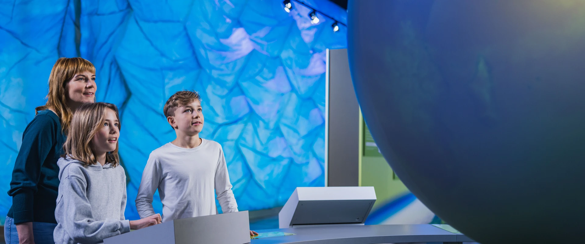 Familie mit Besucherbetreuer bei Führung am interaktiven Globus.