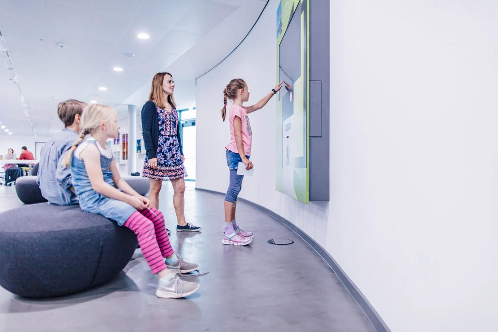 Schüler bei der Bedienung eines KLIMA-Quiz Terminals in der Ausstellung.